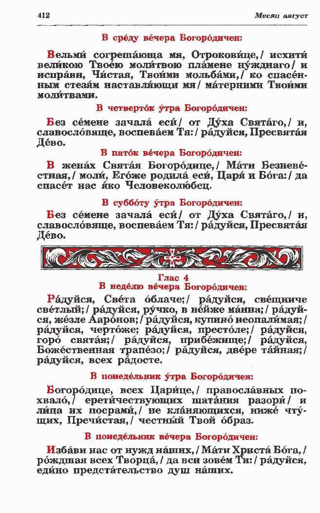 светлый; / радуйся, ручко, в нейже манна; / радуй- ся, жезле Ааронов; / радуйся, купино неопалимая; / радуйся, чертоже; радуйся, престоле;/ радуйся, горб святая;/ радуйся, прибежище;/ радуйся, Божественная трапезо;/ радуйся, двере тайная;/ радуйся, всех радосте. В понедельник утра Богородичен: