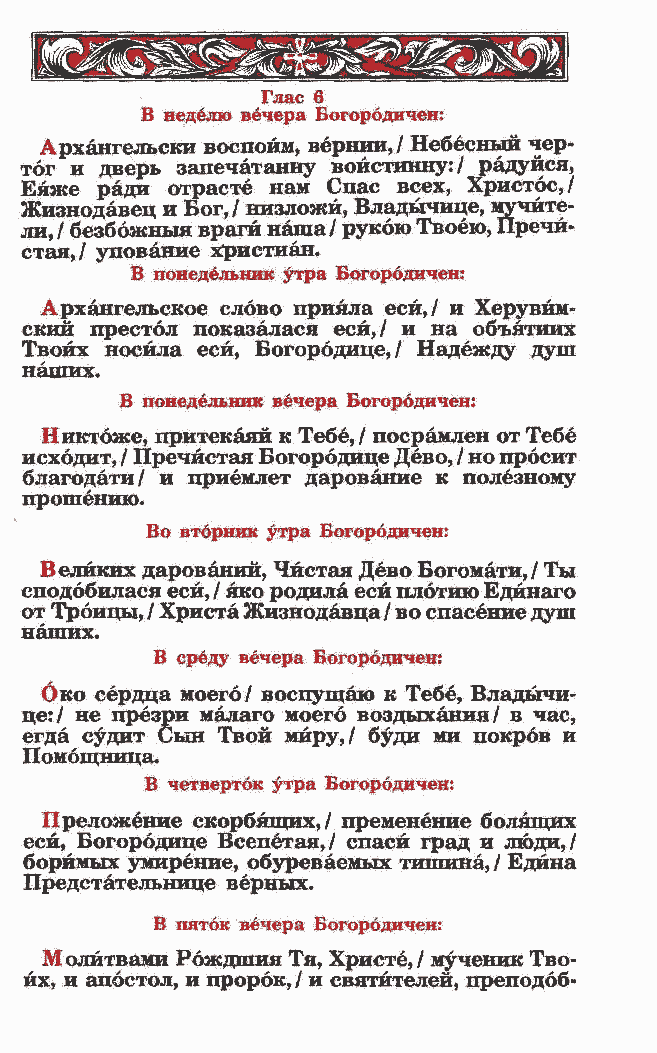 еси, Богородице Всепетая,/ спаси град и люди,/ борймых умирение, обуреваемых тишина, / Едина Предстательнице верных. В пяток вечера Вогородичен: