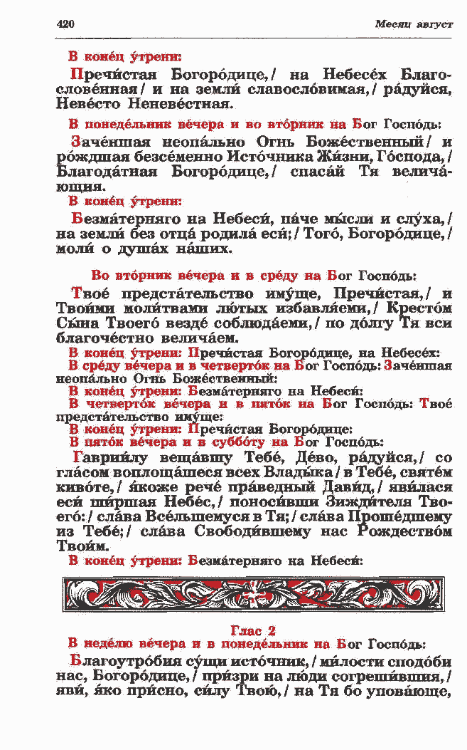 Твоими молитвами лютых избавляеми,/ Крестом Сына Твоего везде соблюдаеми, / по долгу Тя вси благочестно величаем. В конец утрени: Пречистая Богородице, на Небесех: В среду вечера и в четверток на Бог Господь: Заченшая неопально Огнь Божественный: В конец утрени: Безматерняго на Небесй: В четверток вечера и в пяток на Бог Господь: Твое предстательство имуще: В конец утрени: Пречистая Богородице: В пяток вечера и в субботу на Бог Господь: Гавриилу вещавшу Тебе, Дево, радуйся,/ со
