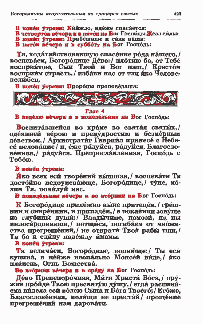 воспеваем, Богородице Дево: / плотин» бо, от Тебе восприятою, Сын Твой и Бог наш,/ Крестом восприим страсть,/ избави нас от тли яко Челове- колюбец. В конец утрени: Прорбцы проповедаша: