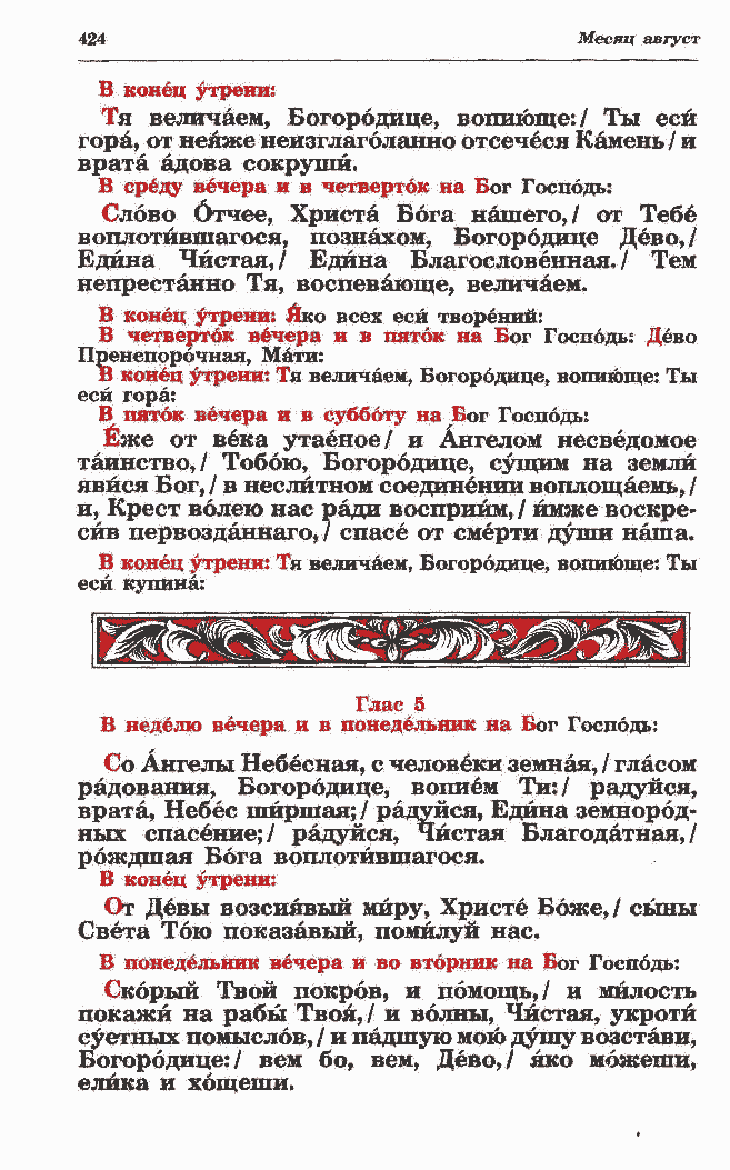 радования, Богородице, вопием Ти:/ радуйся, врата, Небес пгаршая; / радуйся, Едина земнород- ных спасение;/ радуйся, Чистая Благодатная,/ рождшая Бога воплотившагося. В конец утрени: