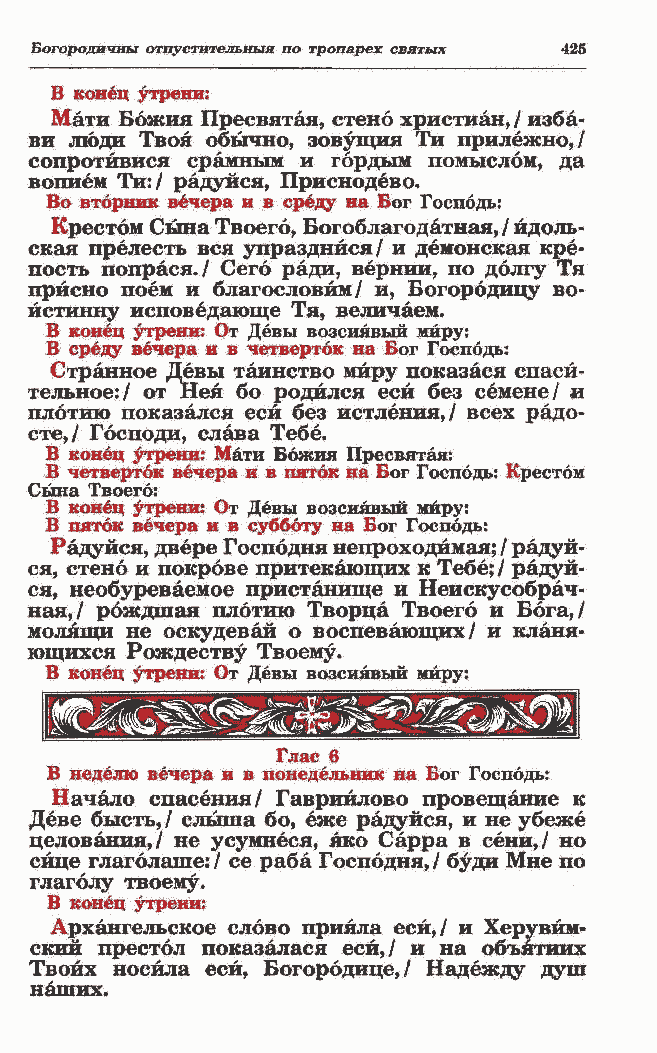тельное:/ от Ней бо родился еси без семене/ и плотню показался еси без истления,/ всех радо- сте,/ Господи, слава Тебе. В конец утрени: Мати Божия Пресвятая: В четверток вечера и в пяток на Бог Господь: Крестом Сына Твоего: В конец утрени: От Девы возсиявый миру: В пяток вечера и в субботу на Бог Господь: Радуйся, двере Господня непроходимая; / радуй-