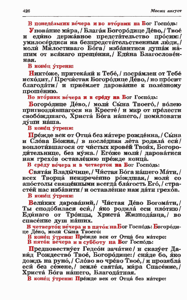 и Слова Божия,/ в последняя лета родила еси/ воплотйвшагося от чистых кровей Твоих, Богоро- дительнице, без мужа./ Егоже моли/ дароватися нам грехов оставлению прежде конца. В среду вечера и в четверток на Вог Господь: