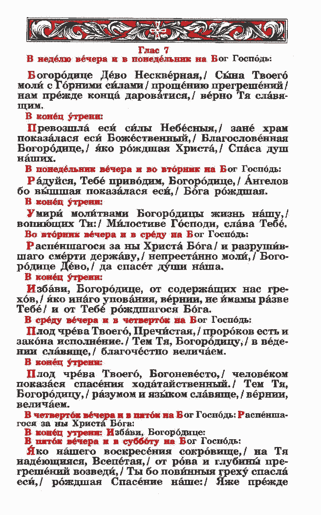 показалася еси Божественный,/ Благословенная Богородице,/ яко рождшая Христа,/ Спаса душ наших. В понедельник вечера и во вторник на Бог Господь: