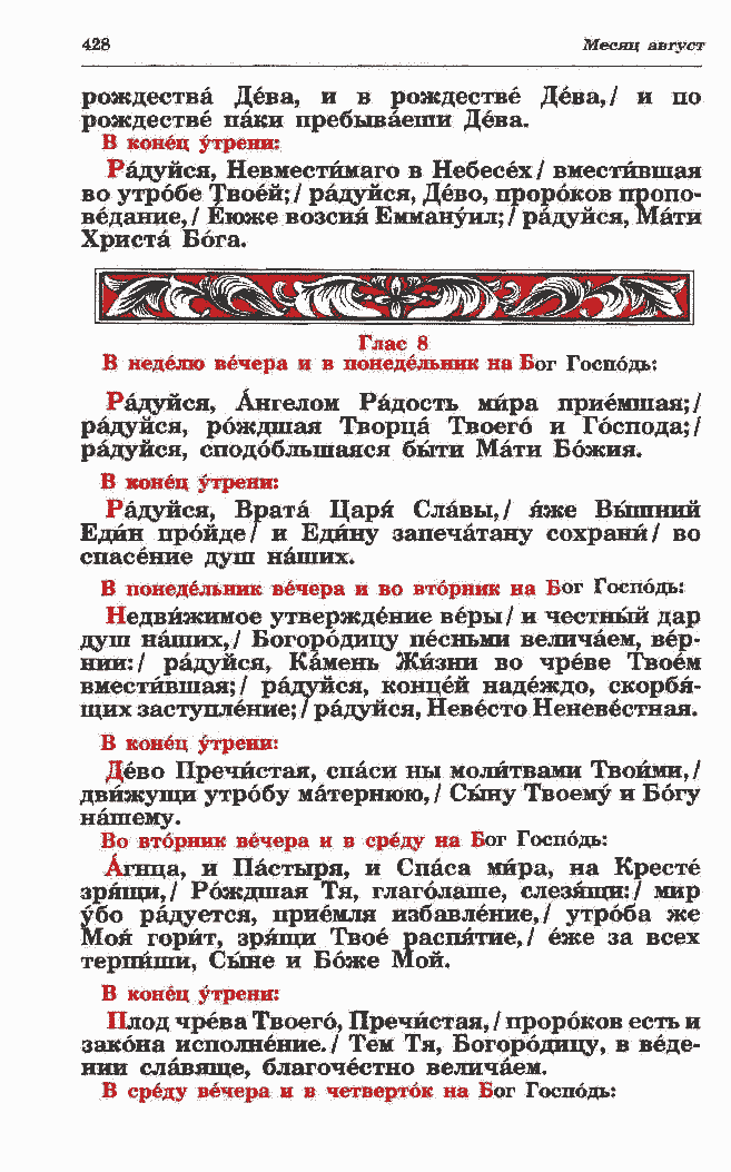 радуйся, рбждшая Творца Твоего и Господа;/ радуйся, сподбблыпаяся быти Мати Божия. В конец утрени: