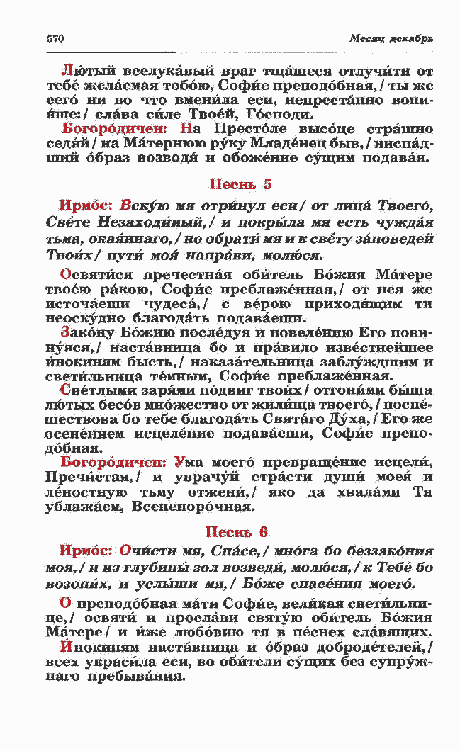 Ирмос: Очисти мя, Спасе, / мнбга бо беззакония моя, /низ глубины зол возведи, молюся, I к Тебе бо возопйх, и услыши мя,/ Боже спасения моего. О преподобная мати Софйе, великая светйльни-