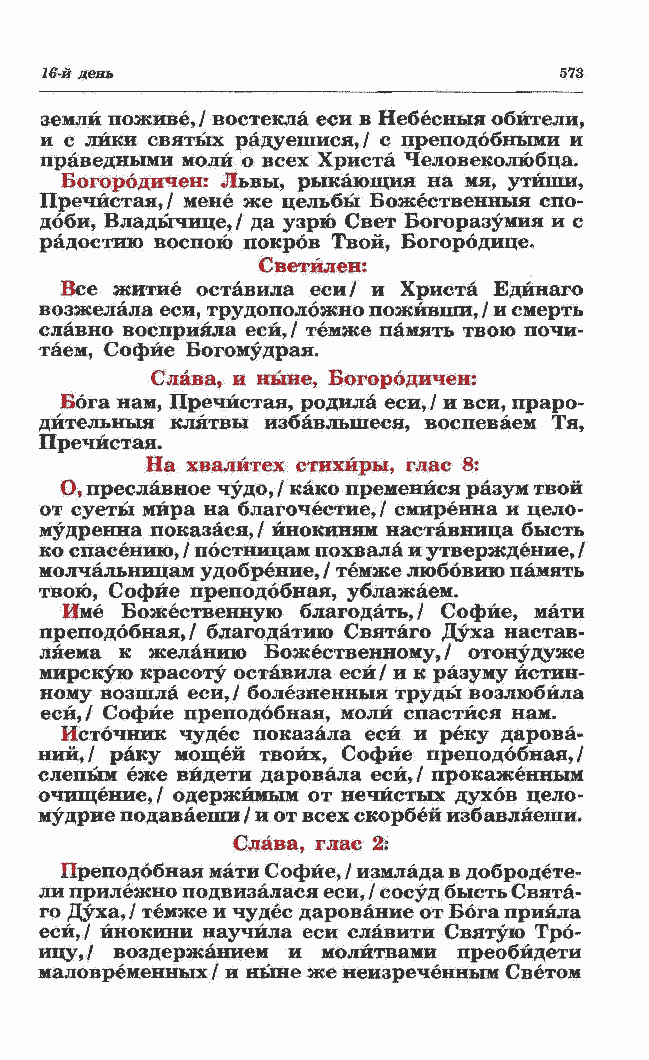 преподобная,/ благодатию Святаго Духа настав- ляема к желанию Божественному,/ отонудуже мирскую красоту оставила еси / и к разуму истин- ному возшла еси, / болезненный труды возлюбила еси,/ Софйе преподобная, моли спастйся нам. Источник чудес показала еси и реку дарова-