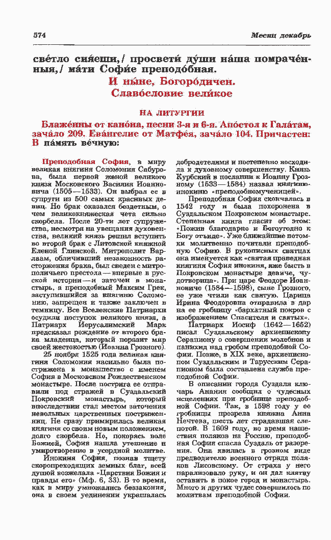 1542 году и была похоронена в Суздальском Покровском монастыре. Степенная книга гласит об этом: «Пожив благодарно и Богоугодно к Богу отьиде». Уже ближайшие потом- ки молитвенно почитали преподоб- ную Софию. В рукописных святцах она именуется как «святая праведная княгиня София инокиня, яже бысть в Покровском монастыре девиче, чу- дотворица». При царе Феодоре Иоан- новиче (1584?1598), сыне Грозного, ее уже чтили как святую. Царица Ирина Феодоровна отправила в дар на ее гробницу «бархатный покров с изображением Спасителя и святых». Патриарх Иосиф (1642?1652)
