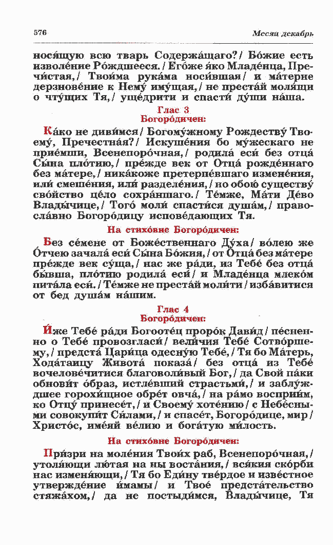 ему, Пречестная? / Искушения бо мужескаго не приемши, Всенепорочная,/ родила еси без отца Сына плотию,/ прежде век от Отца рожденнаго без матере, / никакоже претерпевшаго изменения, или смешения, или разделения, / но обою существу свойство цело сохраншаго. / Темже, Мати Дево Владычице,/ Того моли спастйся душам,/ право- славно Богородицу исповедающих Тя. На стиховне Богородичен: