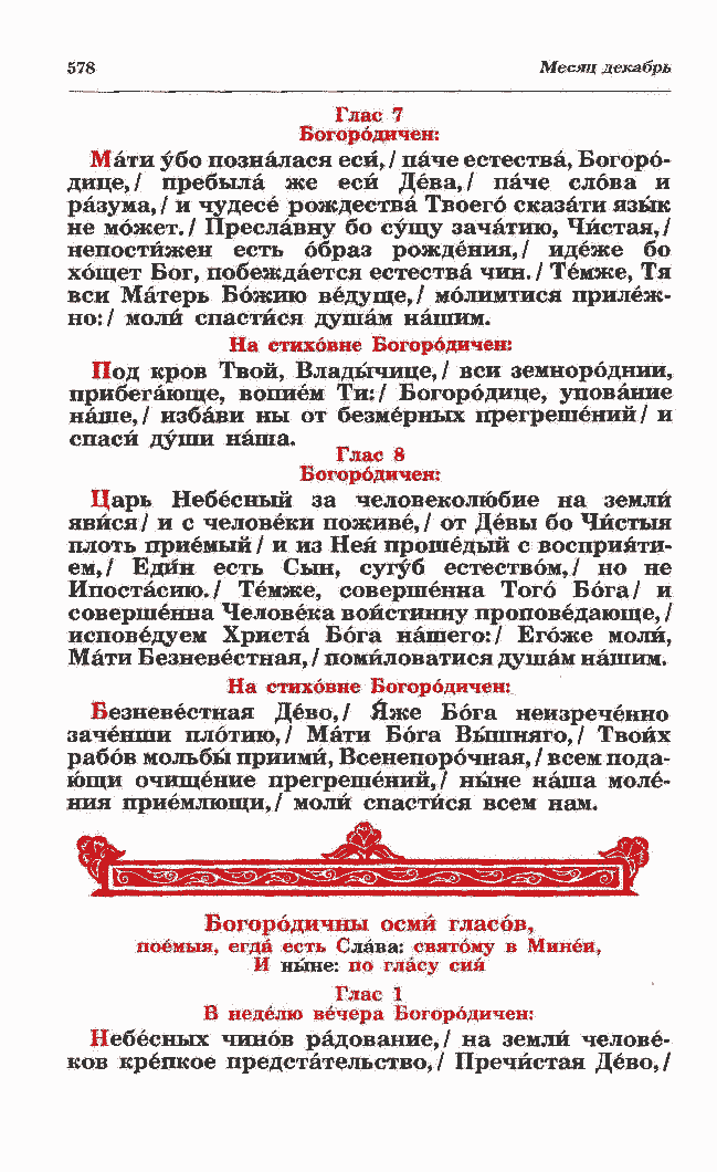 дице,/ пребыла же еси Дева,/ паче слова и разума, / и чудесе рождества Твоего сказати язык не может./ Преславну бо сушу зачатию, Чистая,/ непостижен есть образ рождения,/ идеже бо хощет Бог, побеждается естества чин. / Темже, Тя вси Матерь Божию ведуще,/ молимтися прилеж- но:/ моли спастйся душам нашим. На стиховне Богородичен: