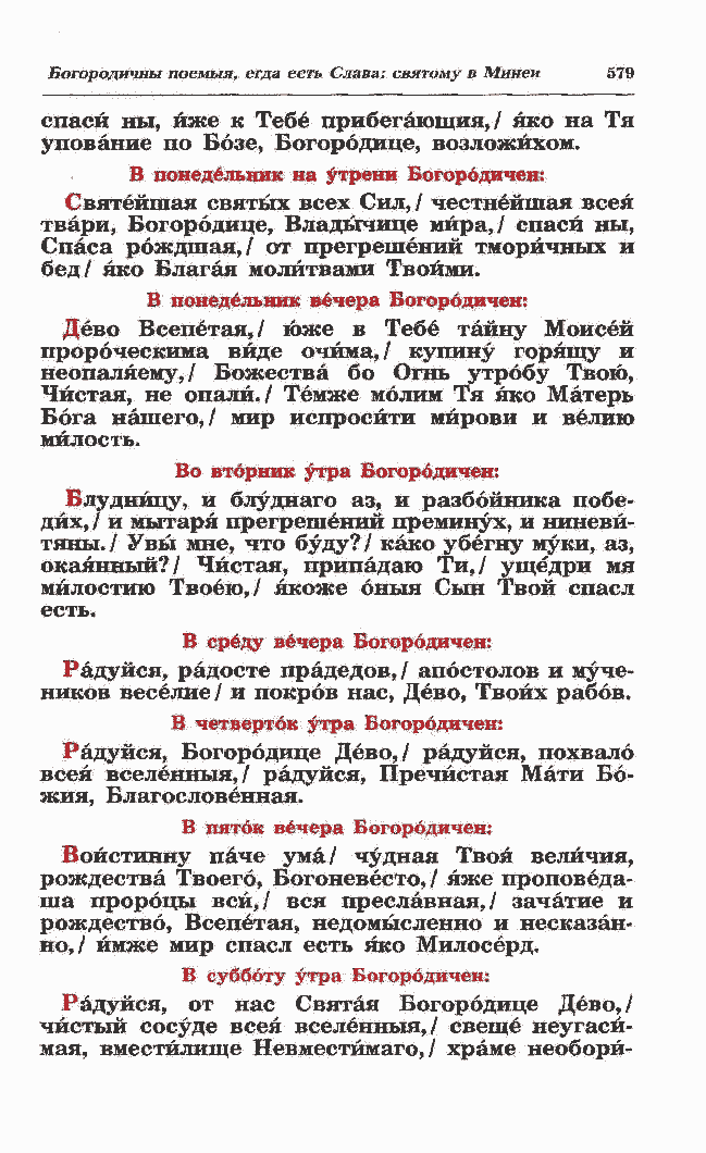 твари, Богородице, Владычице мира,/ спаси ны, Спаса рбждшая,/ от прегрешений тморйчных и бед/ яко Благая молитвами Твоими. В понедельник вечера Богорбдичен: