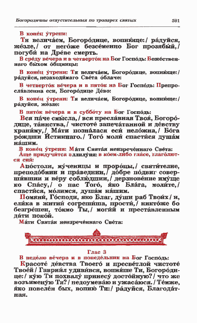 Вся паче смысла, / вся преславная Твоя, Богоро- дице, таинства,/ чистоте запечатанной и девству хратту,/, Мати позналася еси неложна,/ Бога рождши Истиннаго./ Того моли спастйся душам нашим. В конец утрени: Мати Святая неизречеинаго Света: Аще прилучйтся аллилуйя: в кбем-либо гласе, глаголют- ся сия: Апостоли, мученицы и ггрорбцы, / святителие,