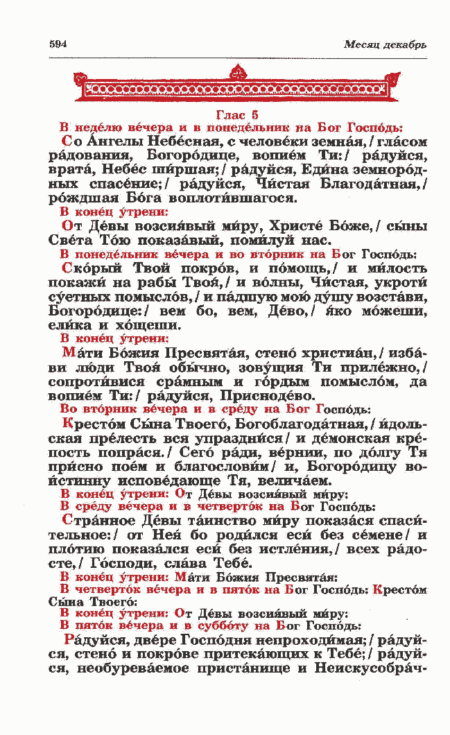 ская прелесть вся упразднйся/ и демонская кре- пость попрася./ Сего ради, вернии, по долгу Тя присно поем и благословим/ и, Богородицу во- йстинну исповедающе Тя, величаем. В конец утрени: От Девы возсиявый миру: В среду вечера и в четверток на Бог Господь: Странное Девы таинство миру показася спаси- тельное:/ от Ней бо родился еси без семене/ и плотиго показался еси без истления,/ всех раде- ете,/ Господи, слава Тебе. В конец утрени: Мати Божия Пресвятая: В четверток вечера и в пяток на Бог Господь: Крестом Сына Твоего: В конец утрени: От Девы возсиявый миру: В пяток вечера и в субботу на Бог Господь: Радуйся, двере Господня непроходимая; / радуй-