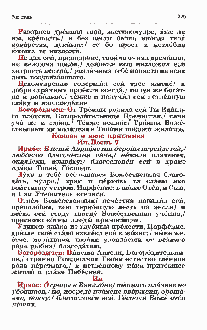 го плотски, Богородйтельниде Пречистая,/ паче ума же и слова./ Темже вопию:/ Троицы Боже- ственный мя молитвами Твоими покажи жилище. Кондак и икос праздника Ин. Песнь 7 Ирмос: В пещи Авраамстии отроцы персйдстей,/