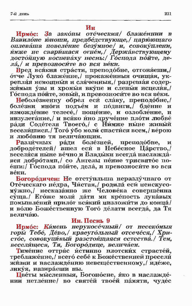 Отеческаго недра, Чистая,/ родила еси неискусо- мужно,/ несказанно же Человека совершенна суща./ Егоже моли дати ми крепость лукавых помышлений прилег всякий низложйти до конца/ и волю Божественную Того делати всегда, да Тя величаю. Ин. Песнь 9