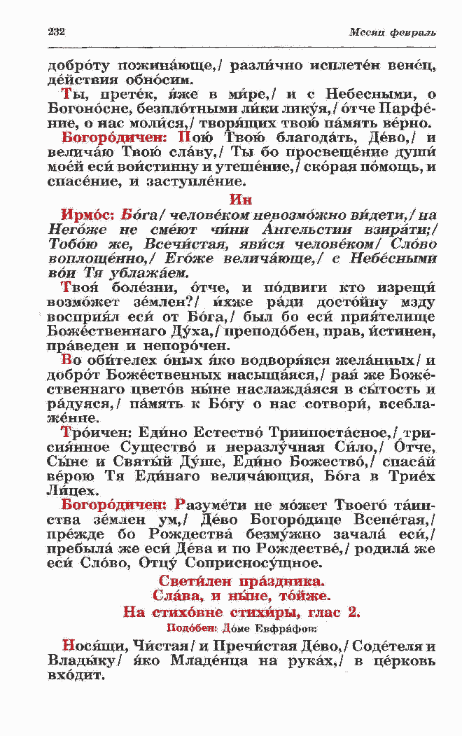 Негоже не смеют чини Ангельстии взирати;/ Тобою же, Всечйстая, явйся человеком/ Слово воплощенно,/ Егоже величающе,/ с Небесными вой Тя ублажаем. Твоя болезни, отче, и подвиги кто изрещй