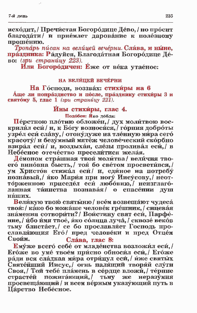 твоя: / како бо можаше человек грешник, / сицевая знамения сотворйти?/ Воистину свят еси, Парфе- ние, / ибо имя твое, яко солнца луча, / сквозе веков тьму блистает,/ се бо прославляет Господь про- славляющия Его/ пред человеки и пред Отцем Своим. Слава, глас 8: Емуже всего себе от младенства возложил еси,/