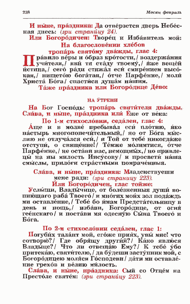 учителя,/ яви тя стаду твоему,/ яже вещей истина,/ сего ради стяжал еси смирением высо- кая,/ нищетою богатая,/ отче Парфение,/ моли Христа Бога/ спастйся душам нашим. Таже праздника или Богородице Дево: