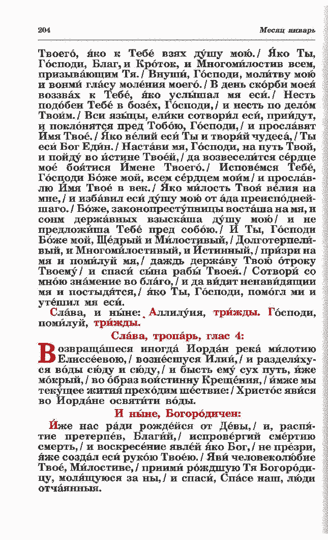 Господи, Благ, и Кроток, и Многомилостив всем, призывающим Тя. / Внуши, Господи, молитву мою и вонмй гласу моления моего. / В день скорби моей воззвах к Тебе, яко услышал мя еси./ Несть подобен Тебе в бозех, Господи, / и несть по делом Твоим. / Вси язьщы, елйки сотворил еси, прийдут, и поклонятся пред Тобою, Господи,/ и прославят Имя Твое. / Яко велий еси Ты и творяй чудеса, / Ты еси Бог Един. / Настави мя, Господи, на путь Твой, и пойду во истине Твоей, / да возвеселится сердце мое боятися Ймене Твоего./ Исповемся Тебе, Господи Боже мой, всем сердцем моим / и прослав- лю Имя Твое в век./ Яко милость Твоя велия на мне, / и избавил еси душу мою от ада преисподней- шаго. / Боже, законопреступницы восташа на мя, и сонм державных взыскаша душу мою/ и не предложйша Тебе пред собою./ И Ты, Господи Боже мой, Щедрый и Милостивый, / Долготерпели- вый, и Многомилостивый, и Истинный, / призри на мя и помилуй мя,/ даждь державу Твою отроку Твоему/ и спаси сына рабы Твоей./ Сотвори со мною знамение во благо, / и да видят ненавидящий мя и постыдится,/ йко Ты, Господи, помогл ми и утешил мя еси. Слава, и ныне: и Аллилуйя, трижды. Господи,