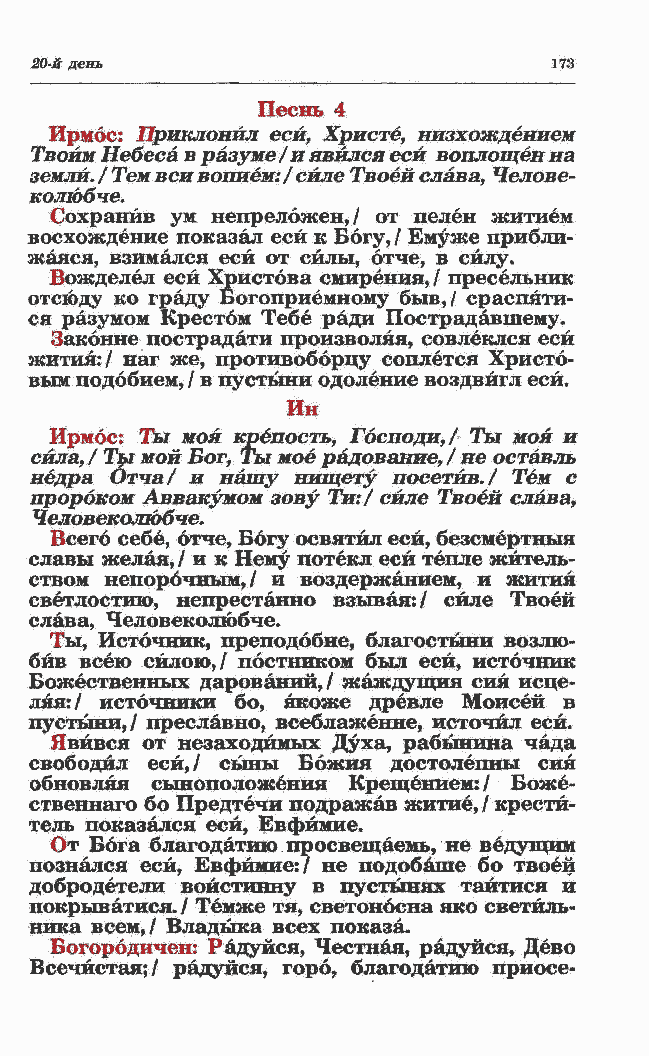 сила, / Ты мой Бог, Ты мое радование, / не оставль недра Отча/ и неону нищету посетив./ Тем с пророком Аввакумом зову Ти;/ силе Твоей слава, Человеколюбче. Всего себе, отче, Богу освятил еси, безсмертныя