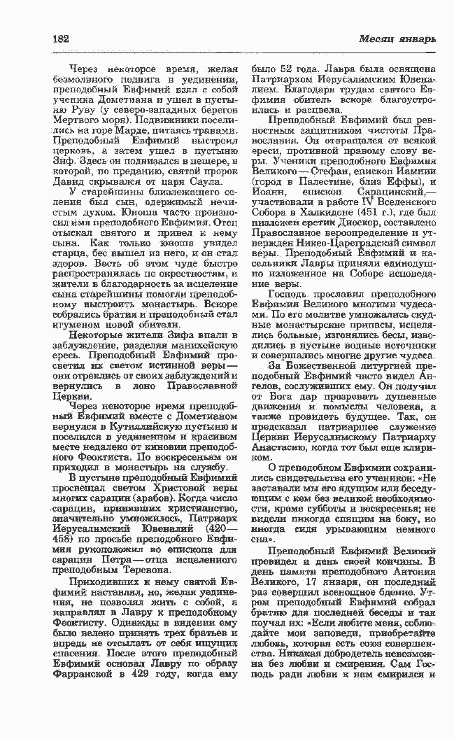 безмолвного подвига в уединении, преподобный Евфимий взял с собой ученика Дометиана и ушел в пусты- ню Руву (у северо-западных берегов Мертвого моря). Подвижники посели- лись на горе Марде, питаясь травами. Преподобный Евфимий выстроил церковь, а затем ушел в пустыню Зиф. Здесь он подвизался в пещере, в которой, по преданию, святой пророк Давид скрывался от царя Саула. У старейшины близлежащего се-