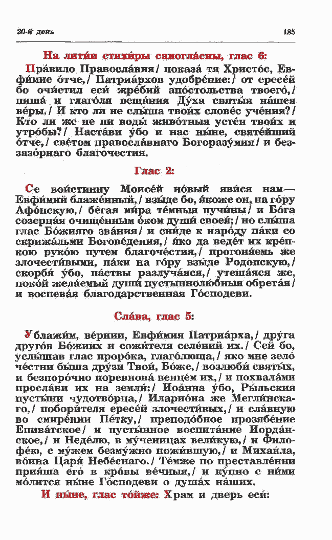 Бвфймий блаженный,/ взыде бо, якоже он, на гору Афонскую,/ бегая мира темныя пучины/ и Бога созерцая очищенным оком души своей; / но слыша глас Божияго звания/ и снйде к народу паки со скрижальми Боговедения, / яко да ведет их креп- кою рукою путем благочестия,/ прогоняемь же злочестйвыми, паки на гору взыде Родопскую,/ скорбя убо, паствы разлучался,/ утешаяся же, покой желаемый души пустыннолюбныя обретая / и воспевая благодарственная Господеви. Слава, глас 5: