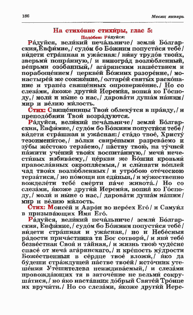 ский, Евфймие, / судом бо Божиим попустйся тебе / вйдети страшная и ужасная:/ стадо твое, Христу тезоименитое,/ волки свирепыми разреваемо и зубы жестоко терзаемо,/ паству твою, на тучней пажити учений твоих воспитанную,/ мечи нече- стивых избиваему,/ церкви же Божия кровьмй православных окропляемый, / и сльпнати воплей чад твоих возлюбленных/ и утробою отеческою терзатися, / но помощи ни едйныя, / и мужественно вожделети тебе смерти паче живота./ Но со слезами, якоже другйй Иеремия, вопия ко Госпо- ду, / моли и ныне о нас,/ даровати душам нашим/ мир и велию милость. Стих: Моисей и Дарон во иереех Его / и Самуил