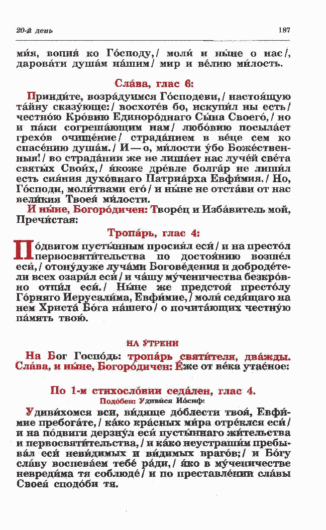 первосвятйтельства по достоянию возшел еси, / отонудуже лучами Боговедения и добродете- ли всех озарил еси / и чашу мученичества безкров- но отпил еси./ Ныне же предстоя престолу Горняго Иерусалима, Евфимие, / моли седящаго на нем Христа Бога нашего / о почитающих честную память твою. на Утрени
