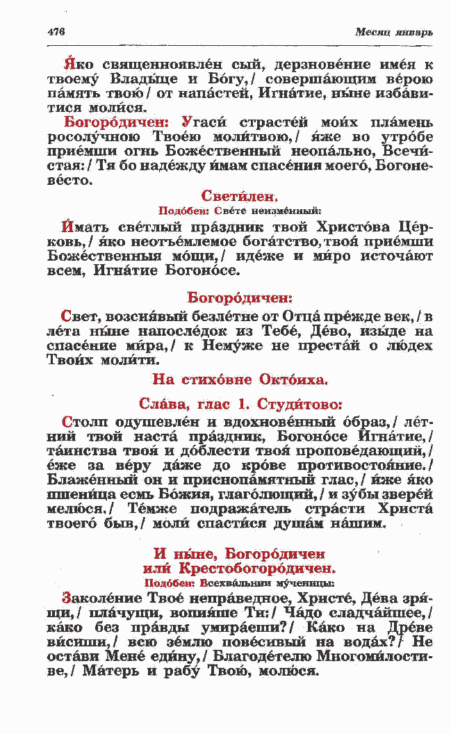 ний твой наста праздник, Богоносе Игнатие,/ таинства твоя и доблести твоя проповедающий, / еже за веру даже до крове противостояние./ Блаженный он и приснопамятный глас,/ йже яко пшеница есмь Божия, глаголющий, / и зубы зверей мелюся./ Темже подражатель страсти Христа твоего быв,/ моли спастйся душам нашим. И ныне, Богородичен