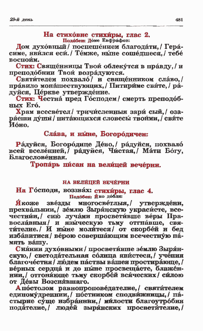 прехвальнии, / землю Зырянскую украсйсте, все- честнйи,/ сию лучами просветивше веры Пра- вославный/ и языческую тьму отгнавше, свя- тйтелие./ И ныне молйтеся/ от скорбей и бед избавится/ верою совершающим всечестную па- мять вашу. Сиянии духовными/ просветивше землю Зырян-
