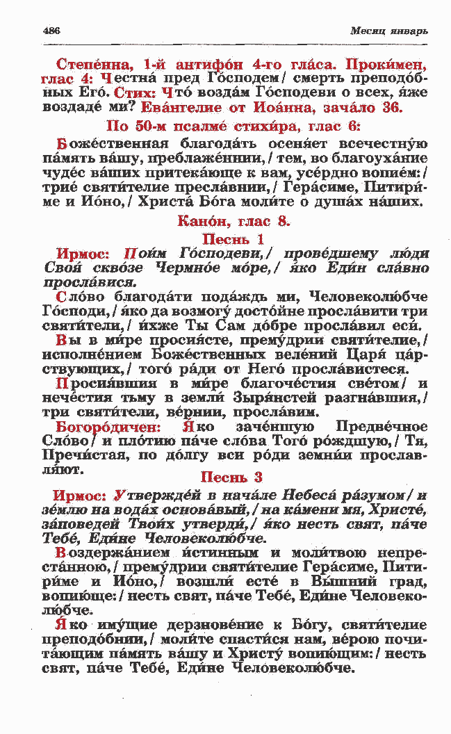 станною, / премудрии святйтелие Герасиме, Пити- рйме и Ионо,/ возшлй есте в Вышний град, вопиюще: / несть свят, паче Тебе, Едине Человеко- лфбче. Яко имущие дерзновение к Богу, святйтелие