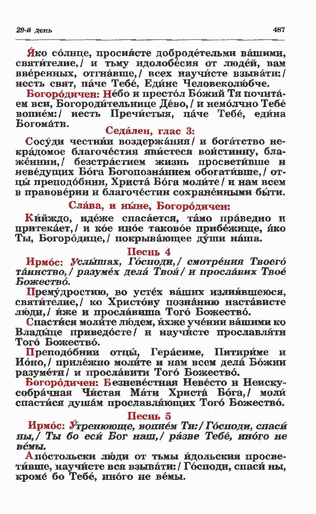 святйтелие,/ и тьму идолобесия от людей, вам вверенных, отгнавше,/ всех научйсте взыватш/ несть свят, паче Тебе, Едйне Человеколюбче. Богородичен: Небо и престол Божий Тя почита-