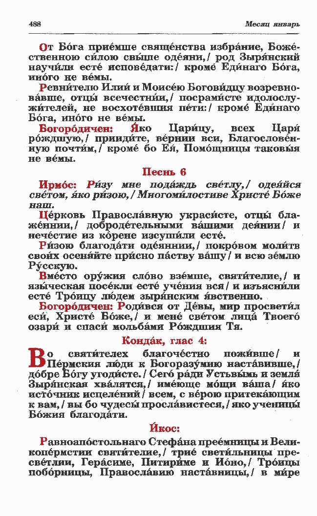 ственною силою свыше одеяни,/ род Зырянский научили есте исповедати:/ кроме Едйнаго Бога, иного не вемы. Ревнителю Илий и Моисею Боговйдцу возревно-