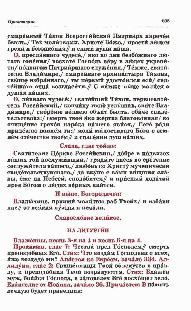 таго гонения/ восхоте Господь веру в людех укрепй- ти/ подвигом Патриаршаго служения./ Темже, святи- телю Владимире,/ смиреннаго архипастыря Тихона, свыше избраннаго,/ ты первый удостоился еси/ свя- тейшего отца возгласйти./ С нймже ныне молйся о душах наших. О, дйвнаго чудесе:/ святейший Тихон, первосвятй-