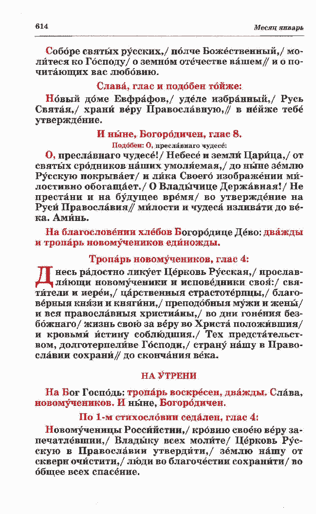 ляющи новомученики и исповедники своя:/ свя- тители и иереи,/ дарственный страстотерпцы,/ благо- верныя князи и княгини,/ преподобный мужи и жены/ и вся православныя христианы,/ во дни гонения без- божнаго/ жизнь свою за веру во Христа положйвшия/ и кровьмй истину соблюдшия./ Тех предстательст- вом, долготерпелйве Господи,/ страну нашу в Право- славии сохрани/ до скончания века. НА УТРЕНИ
