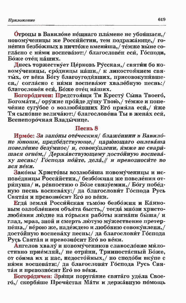 вым озлоблением объята бысть,/ тогда мнбзи христо- любйвии людие на гбрькия работы изгнали бьппа/ и глад, мраз, зной и смерть лютую мужественне претер- пеша,/ верою же, надеждею и люббвию совокуплени,/ достойную воспеваху песнь:/ да благословит Господа Русь Святая и превозносит Его во веки. Ангелов хвалу и новомучеников славословие мйло-