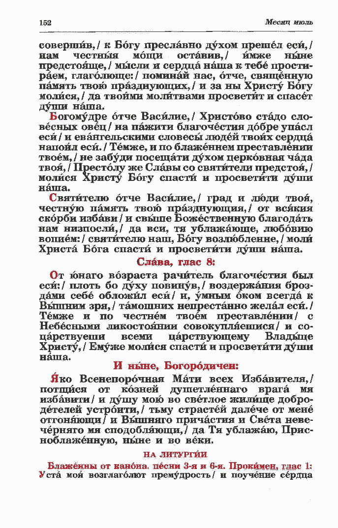 нам честный мощи оставив,/ ймже ныне предстояще, / мысли и сердца наша к тебе прости- раем, глаголюще:/ поминай нас, отче, священную память твою празднующих, / и за ны Христу Богу молйся, / да твоими молитвами просветит и спасет души наша. Богомудре отче Васйлие,/ Христово стадо сло-