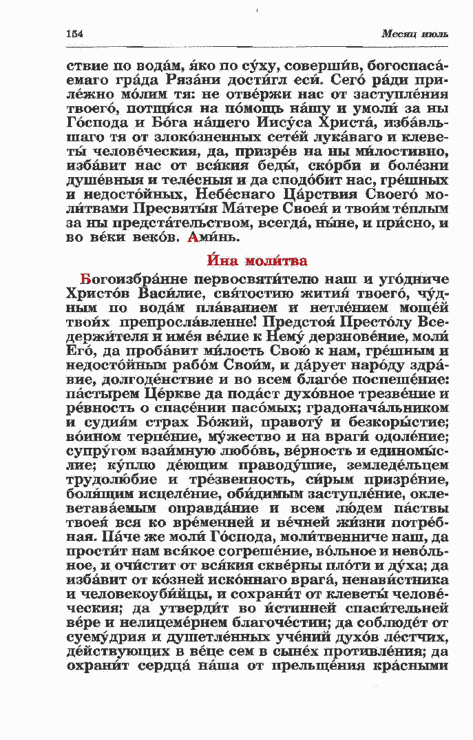 Христов Васйлие, святостию жития твоего, чуд- ным по водам плаванием и нетлением мощей твоих препрославленне! Предстоя Престолу Все- держителя и имея велие к Нему дерзновение, моли Его, да пробавит милость Свою к нам, грепхным и недостойным рабом Своим, и дарует народу здра- вие, долгоденствие и во всем благое поспешение: пастырем Церкве да подаст духовное трезвение и ревность о спасении пасомых; градоначальником и судиям страх Божий, правоту и безкорыстие; воином терпение, мужество и на враги одоление; супругом взаимную любовь, верность и единомыс- лие; куплю деющим праводунше, земледельцем трудолюбие и трезвенность, сирым призрение, болящим исцеление, обйдимым заступление, окле- ветав аемым оправдание и всем люд ем паствы твоея вся ко временней и вечней жизни потреб- ная. Паче же моли Господа, молйтвенниче наш, да простит нам всякое согрешение, вольное и неволь- ное, и очистит от всякия скверны плоти и духа; да избавит от козней исконнаго врага, ненавистника и человекоубийцы, и сохранит от клеветы челове- ческия; да утвердит во истинней спасйтельней вере и нелицемерней благочестии; да соблюдет от суемудрия и душетленных учений духов лестчих, действующих в веце сем в сынех противления; да охранит сердца наша от прельщения красными |