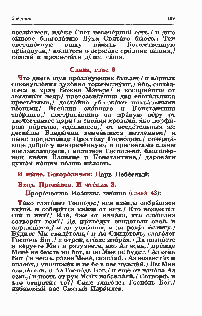 совокупления духовно торжествуют, / ибо, сошед- шеся в храм Божия Матере/ и восприемше от земленых недр/ провозсиявпшя два светильника пресветлыя,/ достойно ублажают похвальными песньми/ Василия славнаго и Константина твердаго,/ пострадавший за правую веру от злочестйваго царя/ и своими кровьмй, яко порфи- рою царскою, одеявшеся,/ от вседетельныя же десницы Владычни венчавшеся нетлением/ и ныне предстояще Престолу Господню,/ созерца- юще доброту неизреченную/ и пресветлыя славы наслаждающеся, / молитеся Господеви, благовер- нии князи Васйлие и Константине,/ даровати душам нашим велию милость. И ныне, Богородичен: Царь Небесный: