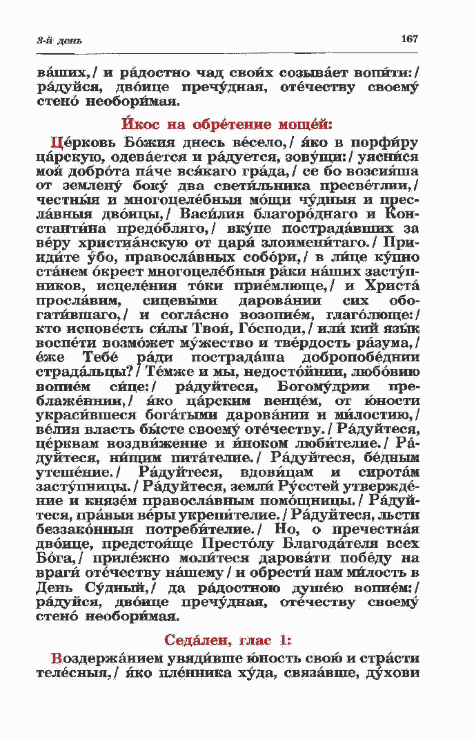 царскую, одевается и радуется, зовущи: / уяснйся моя доброта паче всякаго града, / се бо возсияша от землену боку два светильника пресветлии,/ честныя и многоцелебныя мощи чудныя и прес- лавныя двоицы,/ Василия благороднаго и Кон- стантина предобляго,/ вкупе пострадавших за веру христианскую от царя злоименйтаго. / При- идйте убо, православных собори,/ в лице купно станем окрест многоцелебныя раки наших заступ- ников, исцеления токи приемлюще,/ и Христа прославим, сицевьгми даровании сих обо- гатйвшаго,/ и согласно возопием, глаголюще:/ кто исповесть силы Твоя, Господи, / или кий язык воспети возможет мужество и твердость разума,/ еже Тебе ради пострадаша добропобеднии страдальцы?/ Темже и мы, недостойнии, любовию вопием сйце:/ радуйтеся, Богомудрии пре- блаясеннии,/ яко царским венцем, от юности украсйвшеся богатыми даровании и мйлостию,/ велия власть бысте своему отечеству. / Радуйтеся, церквам воздвижение и иноком любйтелие./ Ра- дуйтеся, нищим питателие./ Радуйтеся, бедным утешение./ Радуйтеся, вдовицам и сиротам заступницы. / Радуйтеся, земли Русстей утвержде- ние и князем православным помощницы./ Радуй- теся, правыя веры укрепйтелие. / Радуйтеся, льсти беззаконный потребйтелие. / Но, о пречестная двоице, предстояще Престолу Благо дате ля всех Бога,/ прилежно молйтеся даровати победу на враги отечеству нашему / и обрести нам милость в День Судный,/ да радостною душею вопием:/ радуйся, двоице пречудная, отечеству своему стено необоримая. Седален, глас 1: