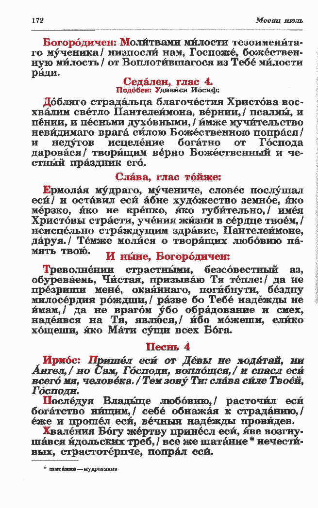 хвалим светло Пантелеймона, вернии,/ псалмы, и пении, и песньми духовными, / ймже мучительство невйдимаго врага силою Божественною попрася / и недугов исцеление богатно от Господа даровася/ творящим верно Божественный и че- стный праздник его. Слава, глас тойже: