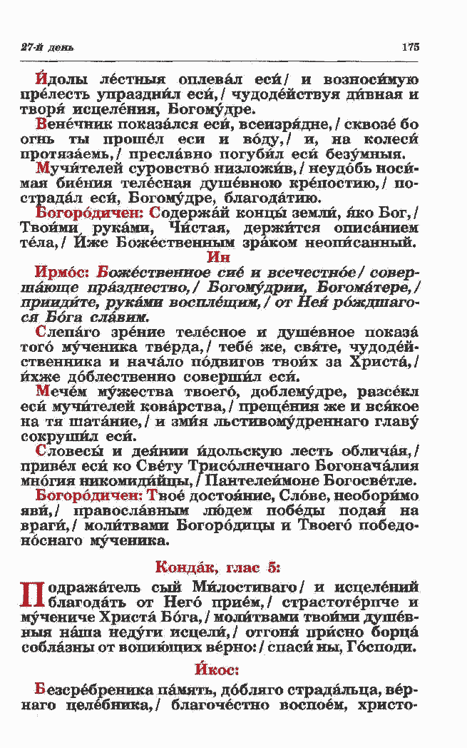 яви,/ православным людем победы подая на враги,/ молитвами Богородицы и Твоего победо- носнаго мученика. Кондак, глас 5: