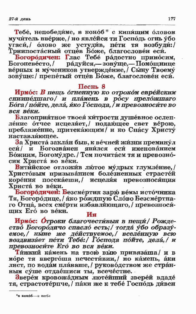 мучитель вверже, / но явлейся ти Господь огнь убо угаси,/ олово же устудйв, пети тя возбуди:/ Триипостасный отцев Боже, благословен еси. Богородичен: Глас Тебе радостно приносим,