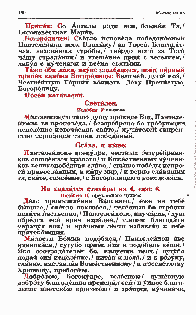 бывшее,/ светло показася,/ телесныя бо страсти целйти явственно, / Пантелеймоне, научаемь, / душ обрелся еси врач изряден,/ словом благодати уврачуя вся/ и мрачныя лести избавляя к тебе притекающий. Милости Божий подобяся,/ Пантелеймон яве
