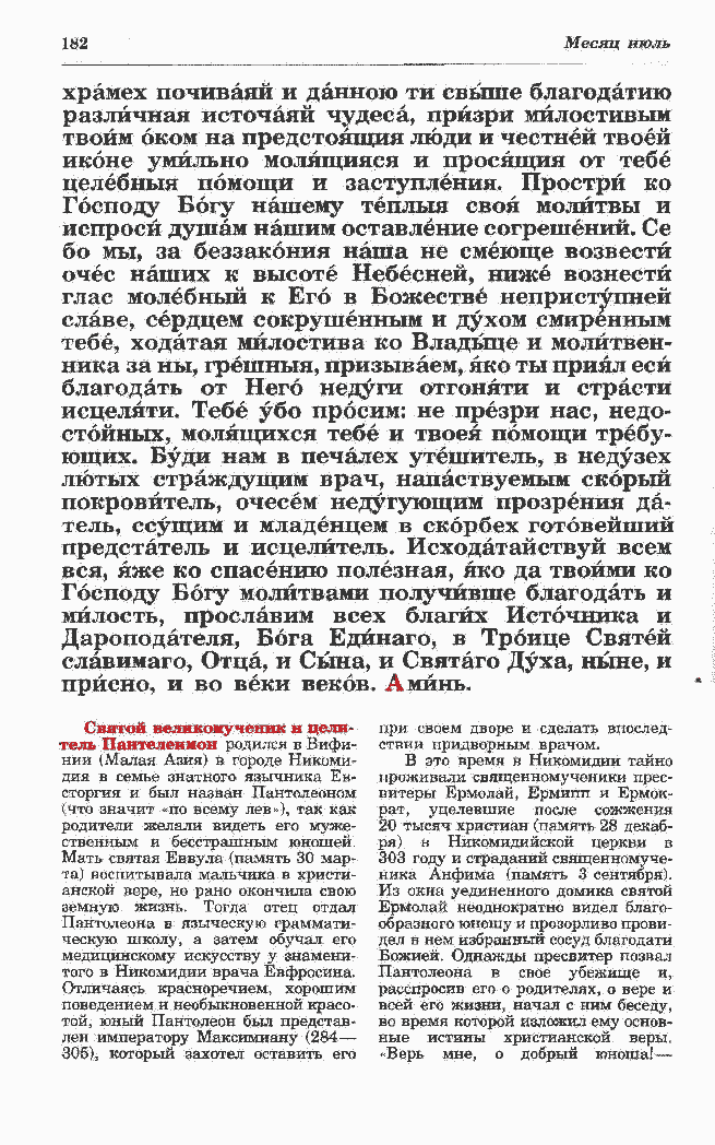 различная источаяй чудеса, призри милостивым твоим оком на предстоящия люди и честней твоей иконе умильно молящийся и просящия от тебе целебный помощи и заступления. Простри ко Господу Богу нашему теплыя своя молитвы и испроси душам нашим оставление согрешений. Се бо мы, за беззакония наша не смеюще возвести очес наших к высоте Небесней, ниже вознести глас молебный к Его в Божестве неприступней славе, сердцем сокрушенным и духом смиренным тебе, ходатая милостива ко Владыце и молитвен- ника за ны, грешныя, призываем, яко ты приял еси благодать от Него недуги отгоняти и страсти исцеляти. Тебе убо просим: не презри нас, недо- стойных, молящихся тебе и твоей помощи требу- ющих. Буди нам в печалех утешитель, в недузех лютых страждущим врач, напаствуемым скорый покровитель, очесем недугующим прозрения да- тель, ссущим и младенцем в скорбех готовейший предстатель и исцелитель. Исходатайствуй всем вся, яже ко спасению полезная, яко да твоими ко Господу Богу молитвами получивше благодать и милость, прославим всех благих Источника и Дароподателя, Бога Едйнаго, в Троице Святей славимаго, Отца, и Сына, и Святаго Духа, ныне, и присно, и во веки веков. А минь. Святой великомученик и цели- при своем дворе и сделать впослед-