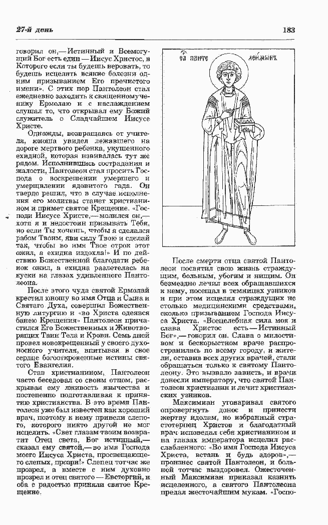опровергнуть донос и принести жертву идолам, но избранный стра- стотерпец Христов и благодатный врач исповедал себя христианином и на глазах императора исцелил рас- слабленного: «Во имя Господа Иисуса Христа, встань и будь здоров»,? произнес святой Пантолеон, и боль- ной тотчас выздоровел. Ожесточен- ный Максимиан приказал казнить исцеленного, а святого Пантолеона предал жесточайшим мукам. «Госпо- |