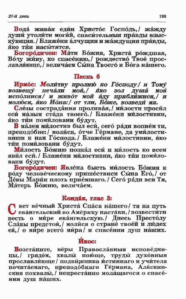 евангельский во Америку настави, / возвестйти весть о мире евангельскую./ Днесь Престолу Славы предстоя,/ молйся о стране твоей и людех ея,/ о мире всего мира/ и спасении душ наших. *