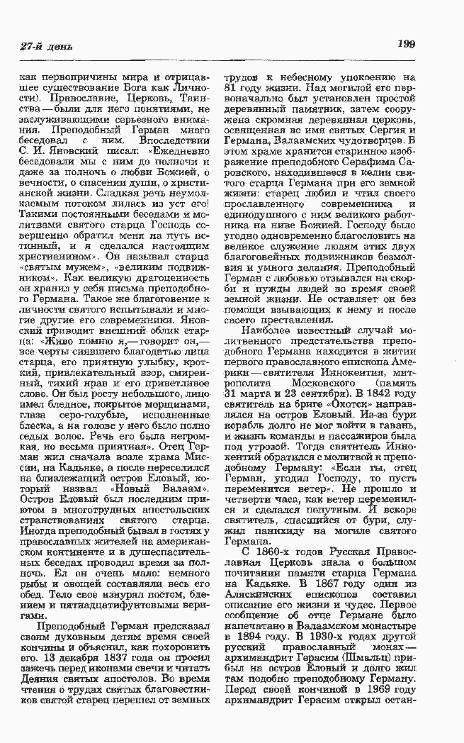шее существование Бога как Лично- сти). Православие, Церковь, Таин- ства? были для него понятиями, не заслуживающими серьезного внима- ния. Преподобный Герман много беседовал с ним. Впоследствии С. И. Яновский писал: «Ежедневно беседовали мы с ним до полночи и даже за полночь о любви Божией, о вечности, о спасении души, о христи- анской жизни. Сладкая речь неумол- каемым потоком лилась из уст его! Такими постоянными беседами и мо- литвами святого старца Господь со- вершенно обратил меня на путь ис- тинный, и я сделался настоящим христианином». Он называл старца «святым мужем», «великим подвиж- ником». Как великую драгоценность он хранил у себя письма преподобно- го Германа. Такое же благоговение к личности святого испытывали и мно- гие другие его современники. Янов- ский приводит внешний облик стар- ца: «Живо помню я,? говорит он,? все черты сиявшего благодатью лица старца, его приятную улыбку, крот- кий, привлекательный взор, смирен- ный, тихий нрав и его приветливое слово. Он был росту небольшого, лицо имел бледное, покрытое морщинами, глаза серо-голубые, исполненные блеска, а на голове у него было полно седых волос. Речь его была негром- кая, но весьма приятная». Отец Гер- ман жил сначала возле храма Мис- сии, на Кадьяке, а после переселился на близлежащий остров Еловый, ко- торый назвал «Новый Валаам». Остров Еловый был последним при- ютом в многотрудных апостольских странствованиях святого старца. Иногда преподобный бывал в гостях у православных жителей на американ- ском континенте и в душеспаситель- ных беседах проводил время за пол- ночь. Ел он очень мало: немного рыбы и овощей составляли весь его обед. Тело свое изнурял постом, бде- нием и гштнадцатифунтовыми вери- гами. Преподобный Герман предсказал