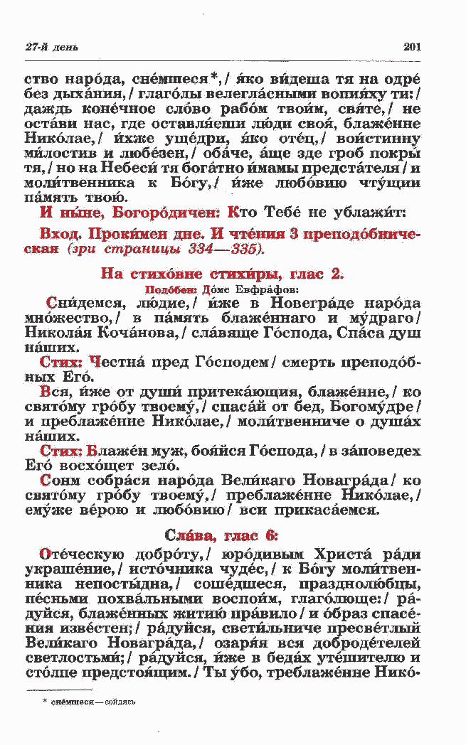 украшение,/ источника чудес,/ к Богу молитвен- ника непостыдна,/ сошедшеся, празднолюбцы, песньми похвальными воспойм, глаголюще:/ ра- дуйся, блаженных житию правило / и образ спасе- ния известен;/ радуйся, светйльниче пресветлый Велйкаго Новаграда,/ озаряя вся добродетелей светлостьмй; / радуйся, йже в бедах утешителю и столпе предстоящим. / Ты убо, треблаженне Нико- |