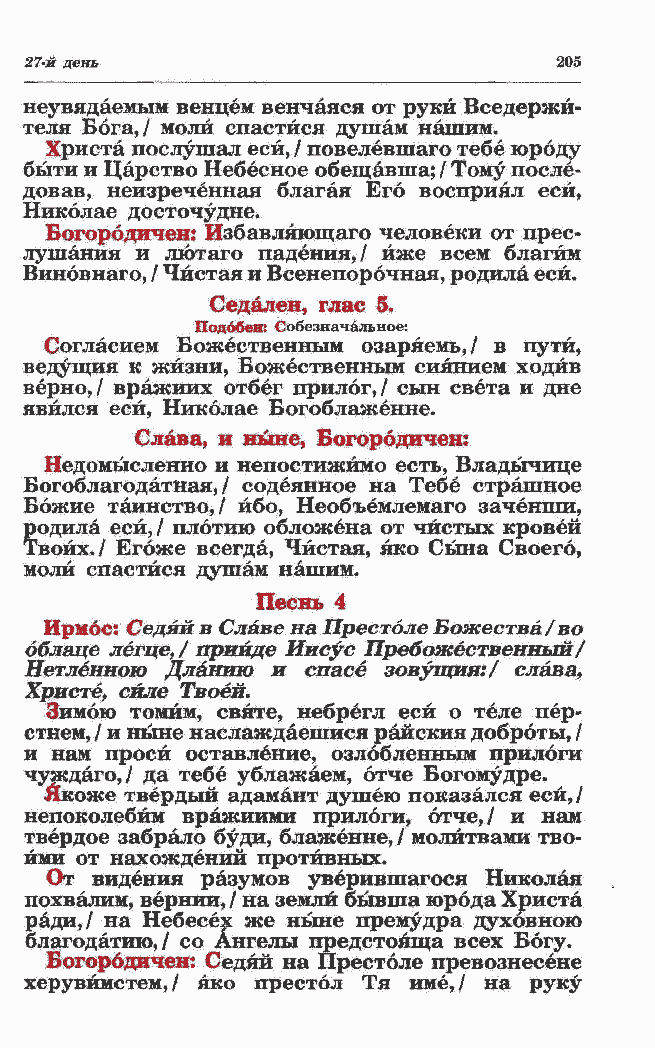 быти и Царство Небесное обещавша; / Тому после- довав, неизреченная благая Его восприял еси, Николае досточудне. Богородичен: Избавляющаго человеки от прес-